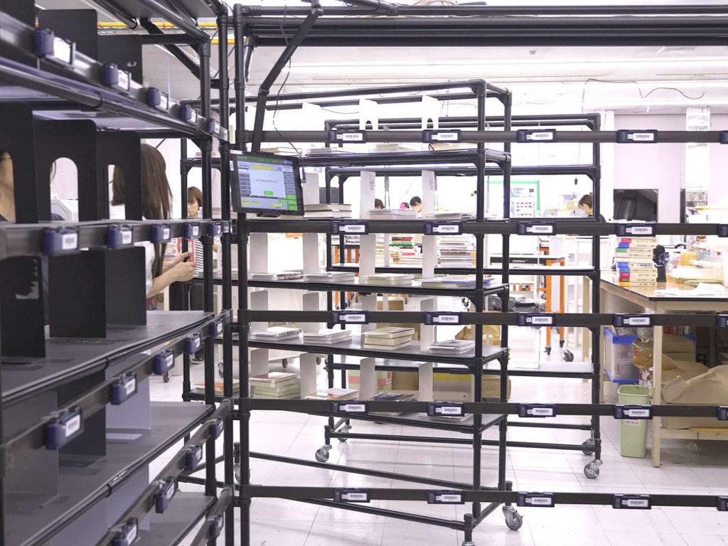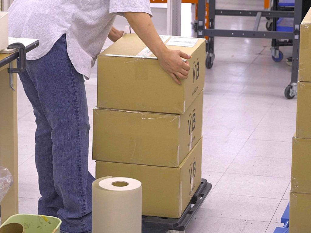 棚ごとにまとめて移動させることで、効率的に梱包作業へとつなげています。