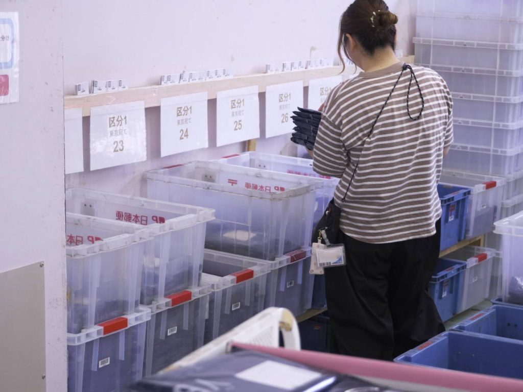 配送先の郵便番号を地域ごとに100個の区分にし、荷物を振り分けケースに入れていきます。