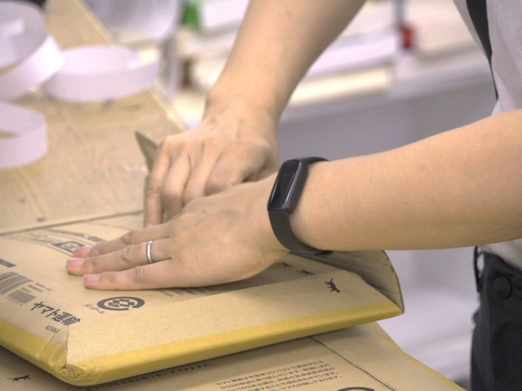 「自分がお客さまの立場に立った時に、これが届いたらいやだな、と思われないように、なるべくきれいな状態でお手元に届くように心がけています。」(梱包をするスタッフ)