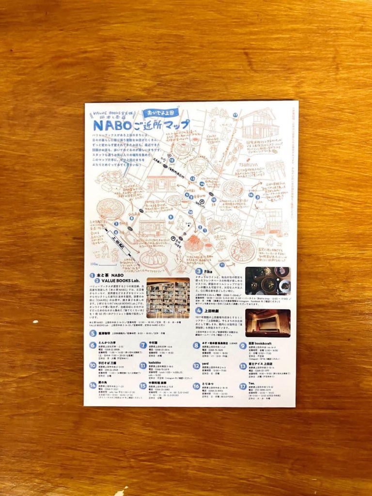 最近ご好評いただいたのはバリューブックスの実店舗「本と茶 NABO(ネイボ)」を中心とした、上田の街のご近所マップ。