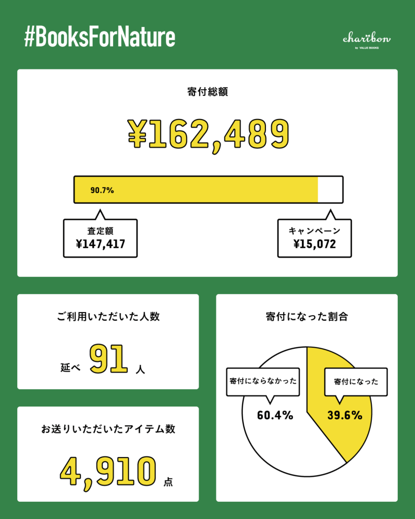 集まった寄付額は16万2,489円、ご参加いただいた方は延べ91名。本の総点数は4,910点にのぼります。そのうち39.6%が寄付として活かされ、自然保護や環境教育などの現場を支える力になりました。