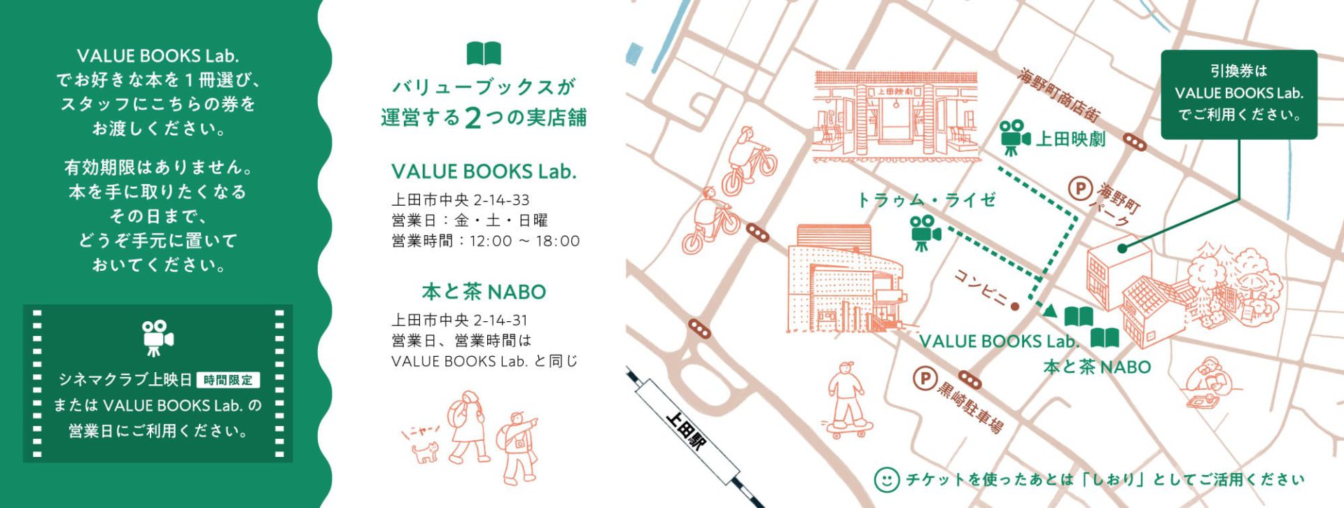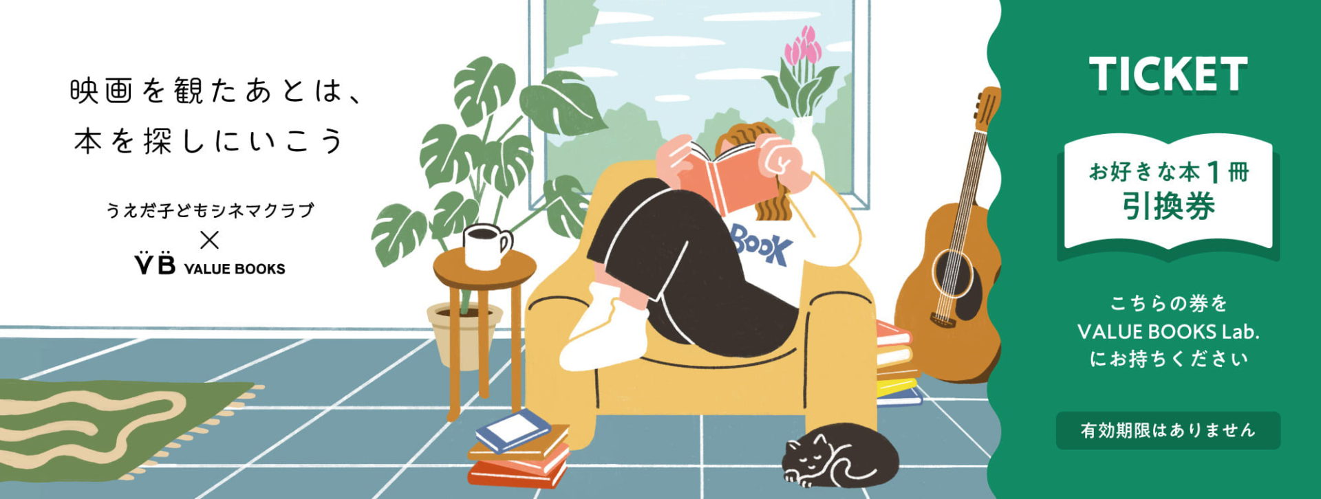 それは、うえだ子どもシネマクラブの上映日に、「バリューブックスラボ(通称:ラボ)」で本1冊と交換できるブックギフトチケットプレゼントする、というもの。