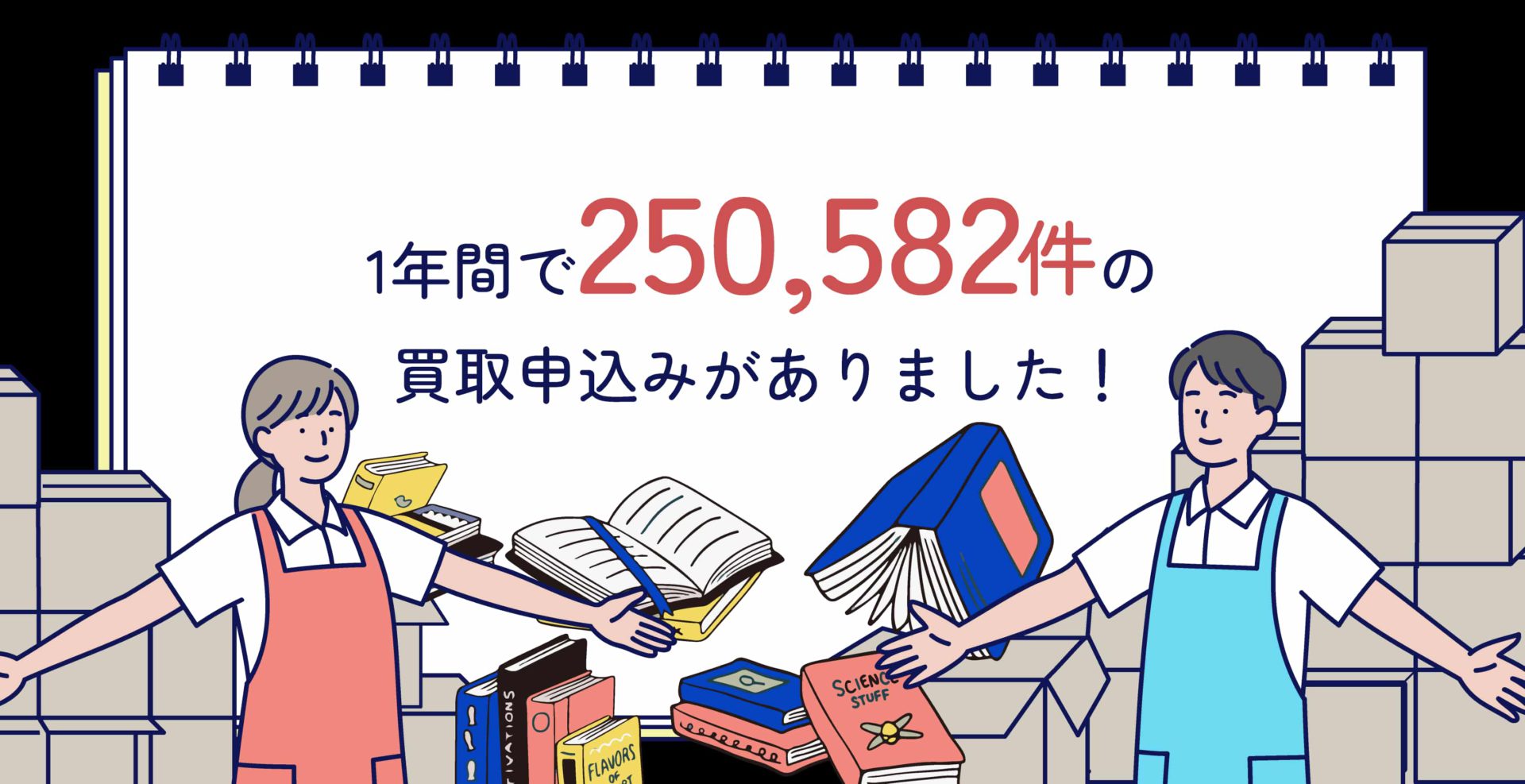 バリューブックスの年間のお申し込み数は、約25万件!毎日、全国津々浦々からたくさんの本を受け取っています。